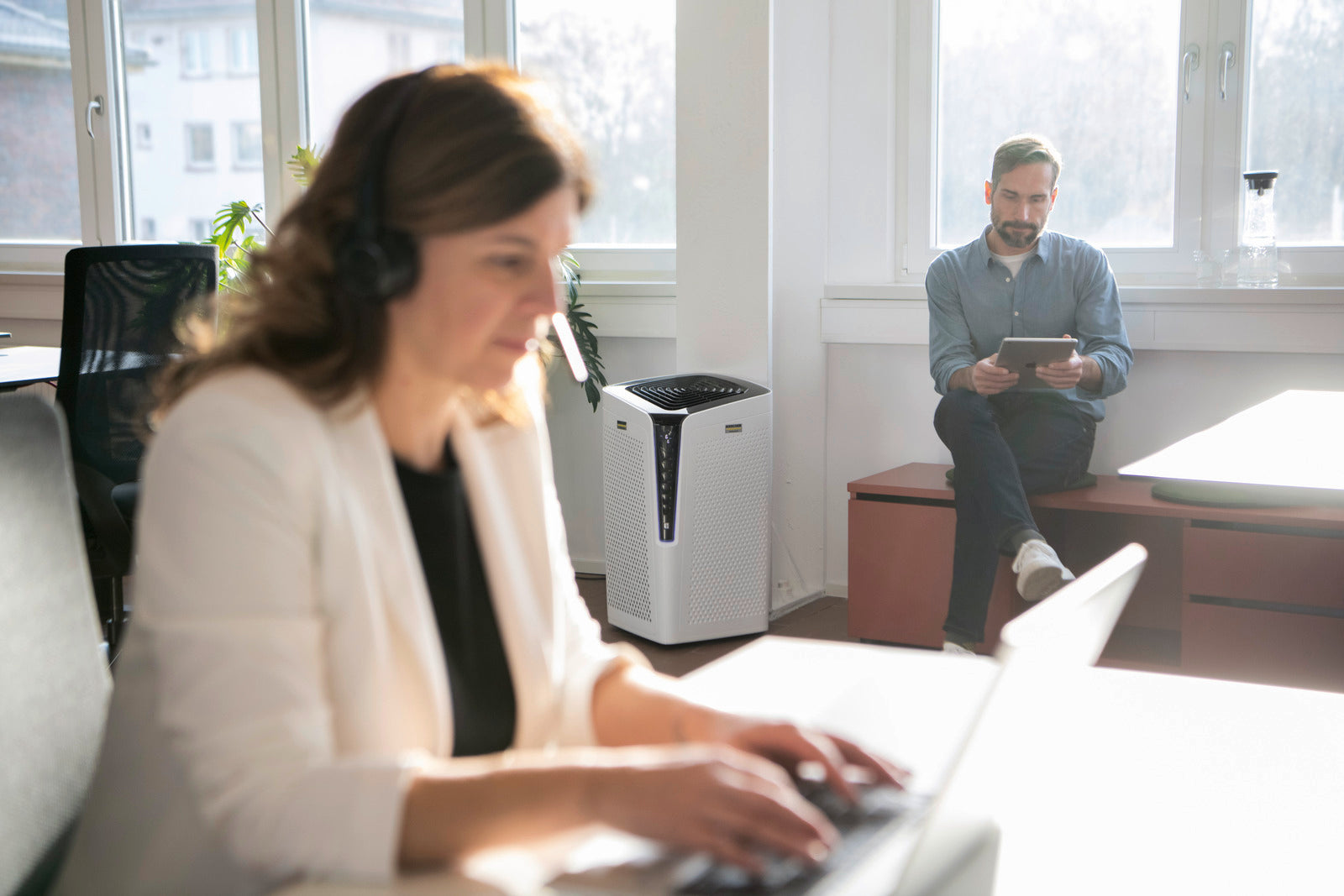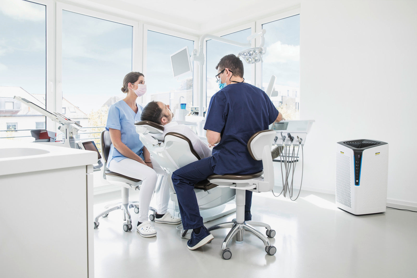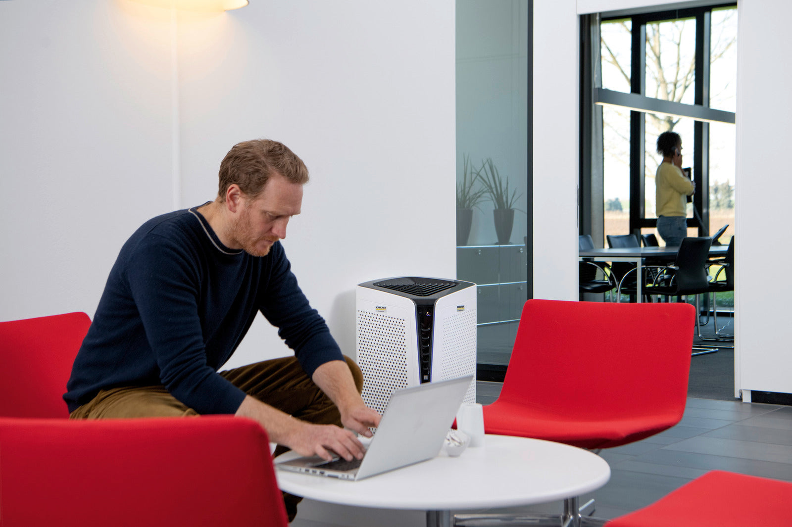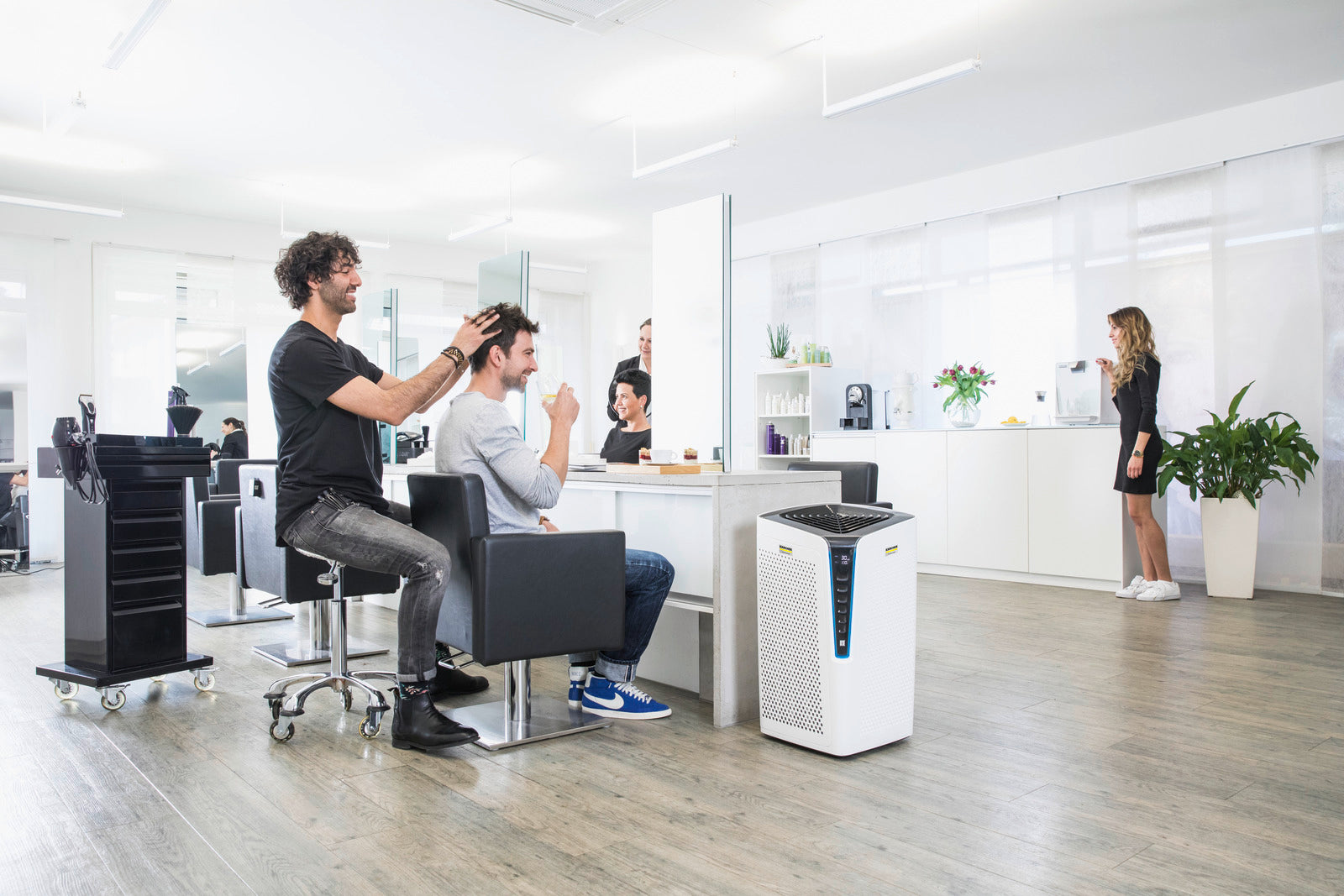 Purificarea aerului de la specialiștii în curățenie: purificatorul de aer AF 100 H13 de la Kärcher este o soluție gata de utilizare pentru spații interioare cu trafic intens și ocupare ridicată, precum săli de clasă, săli de așteptare la medic sau alte instituții publice. Noul filtru High Protect H13 Solution elimină în mod fiabil agenții patogeni, cum ar fi virusurile, și aerosolii din aer, contribuind la un mediu mai sigur și mai sănătos. Un strat suplimentar de ioni de argint aplicat pe materialul filtrant combate eficient germenii și bacteriile, iar stratul de carbon activ absoarbe praful, polenul, mirosurile, substanțele organice volatile, vaporii chimici și alte substanțe nocive. Un senzor laser de înaltă precizie monitorizează continuu calitatea aerului și reglează automat modul de funcționare. Calitatea aerului este afișată clar printr-un grafic codificat pe culori, iar pe ecran pot fi vizualizate în orice moment nivelul de praf fin și durata de viață rămasă a filtrului. Rolele robuste permit mutarea ușoară a dispozitivului dintr-o încăpere în alta.