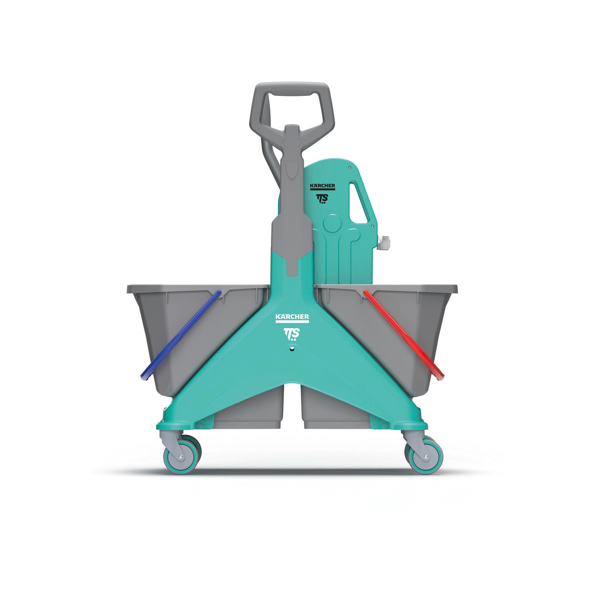Cărucior cu două găleți, cu mâner lateral din plastic, cadru de bază colorat și presă Tec, 2 găleți cu mâner de transport albastru/roșu și roți de direcție ø 80 mm cu protecție la impact.